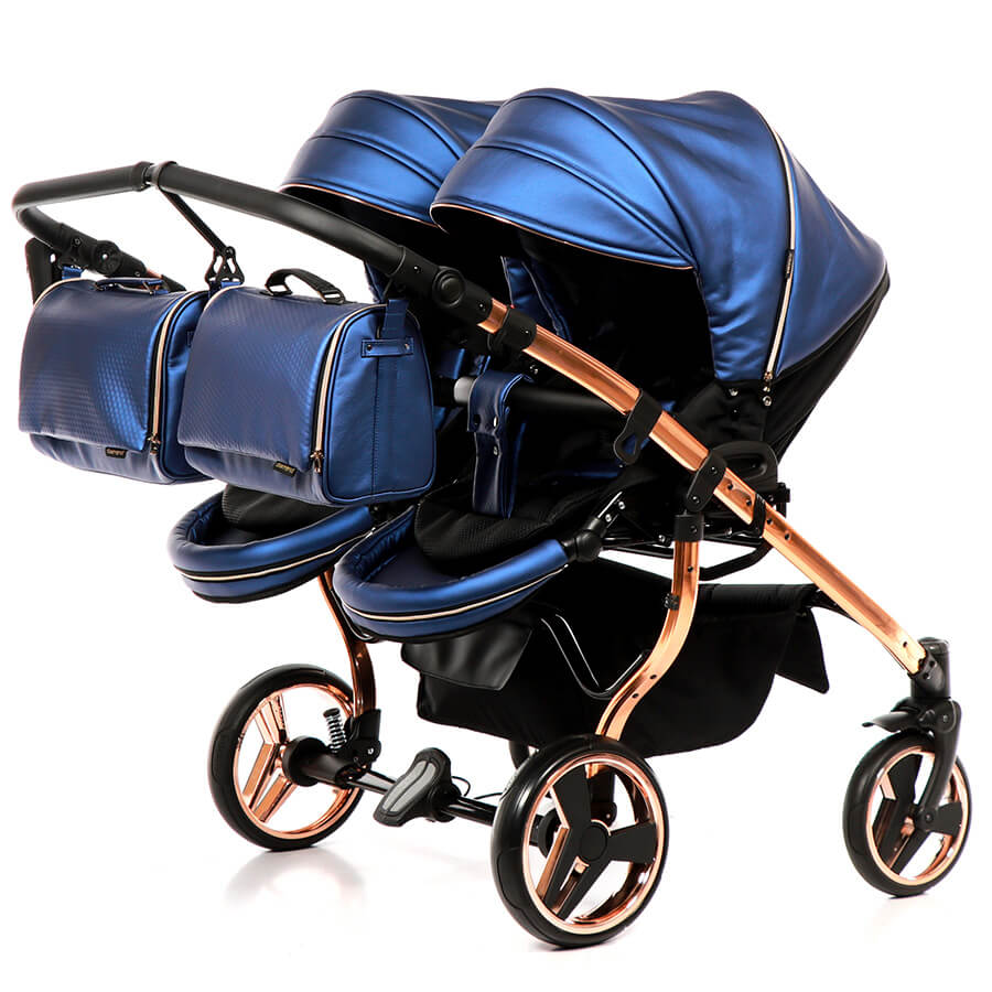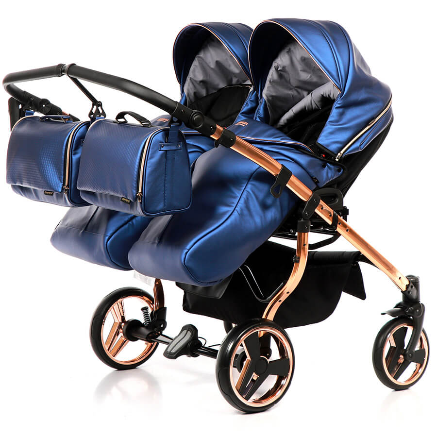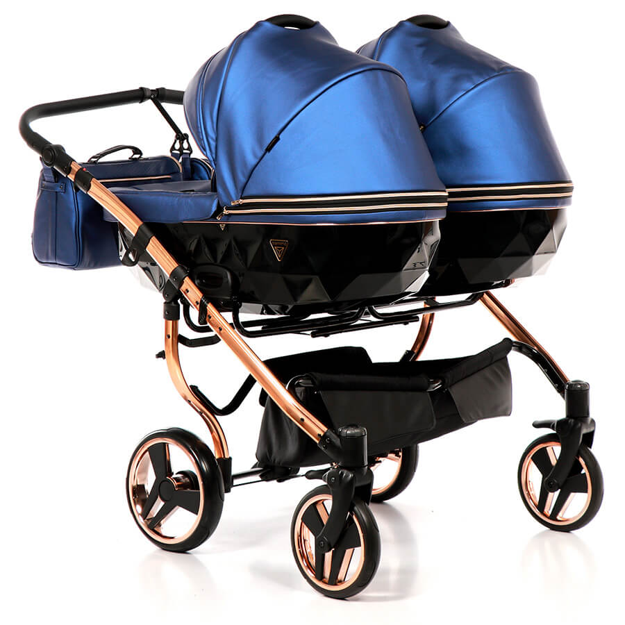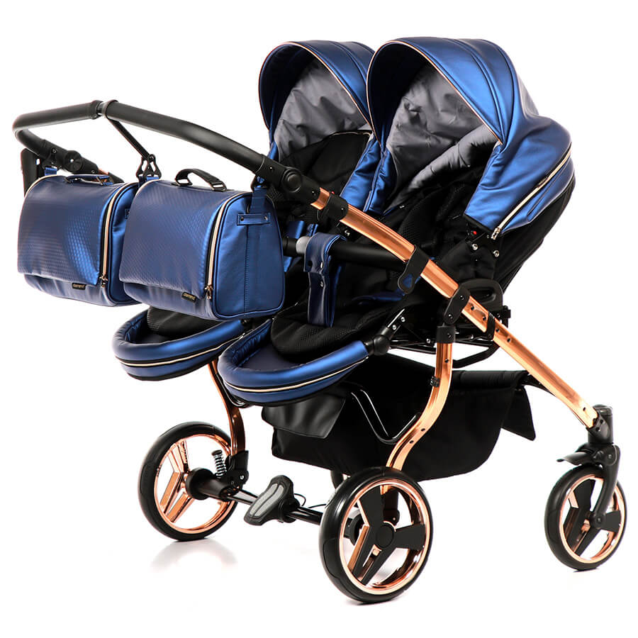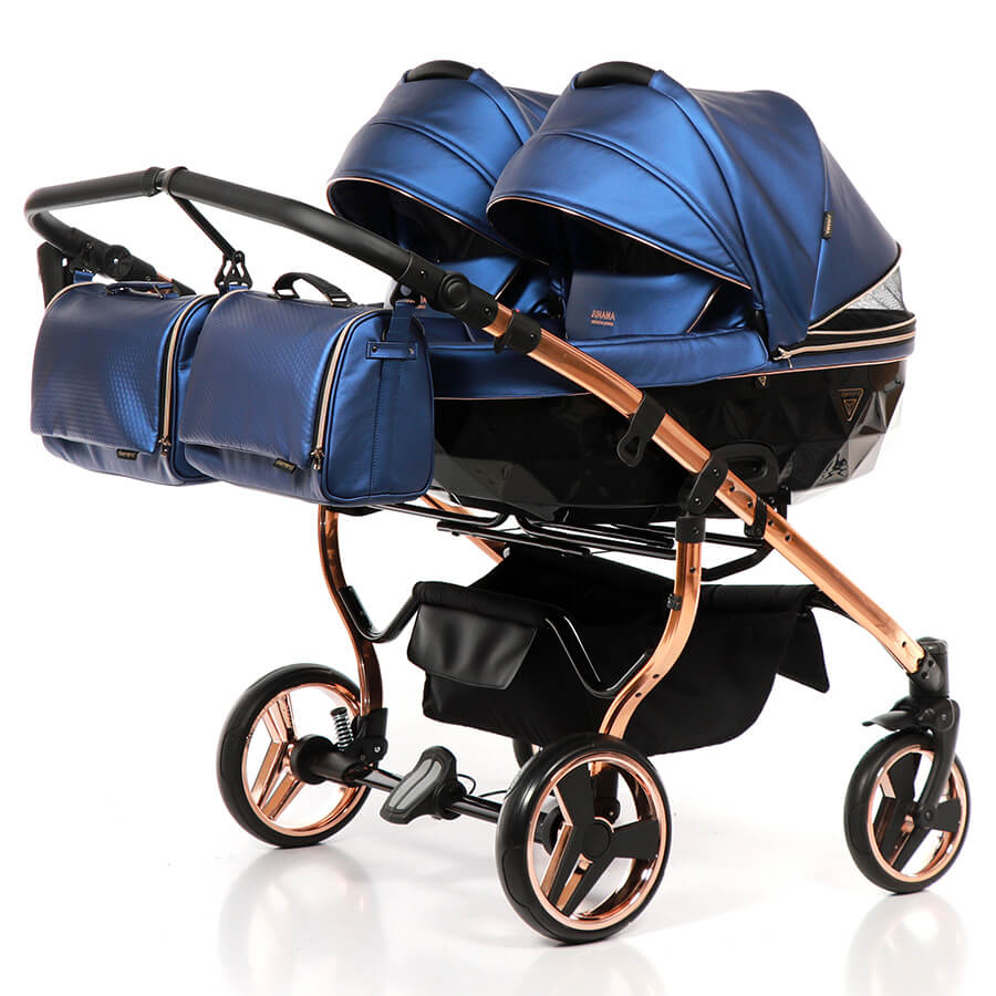 So wie man für seine Kinder ein schönes Zimmer einrichtet, so sucht man sich auch einen schönen Zwillingskinderwagen aus. Den Junama Fluo Line Duo gibt es mit vier Gestellfarben Gold, Kupfer,Blau und Rot. Alle Varianten sehen sehr hochwertig und edel aus. Das Design wirkt sehr schick, aber nicht aufdringlich. Als Zubehör gibt es einen praktischen, stabilen Einkaufskorb, Regenhabe und Mückenschutz für die Sportsitze und Wannen, Wickeltaschen und einen Getränkehalter.